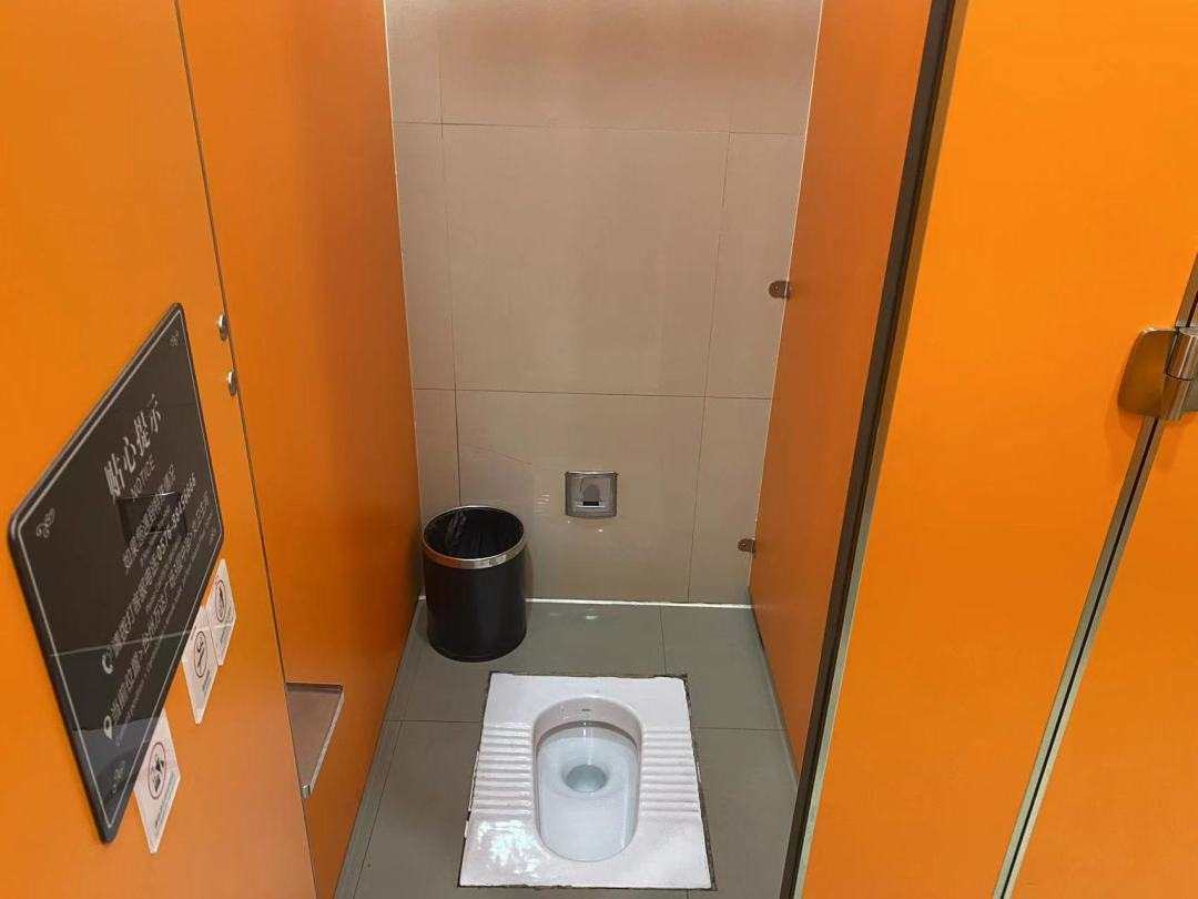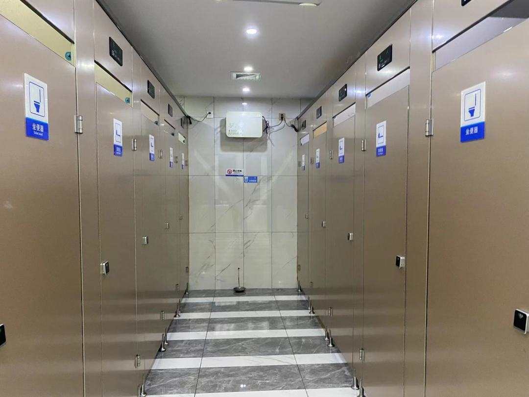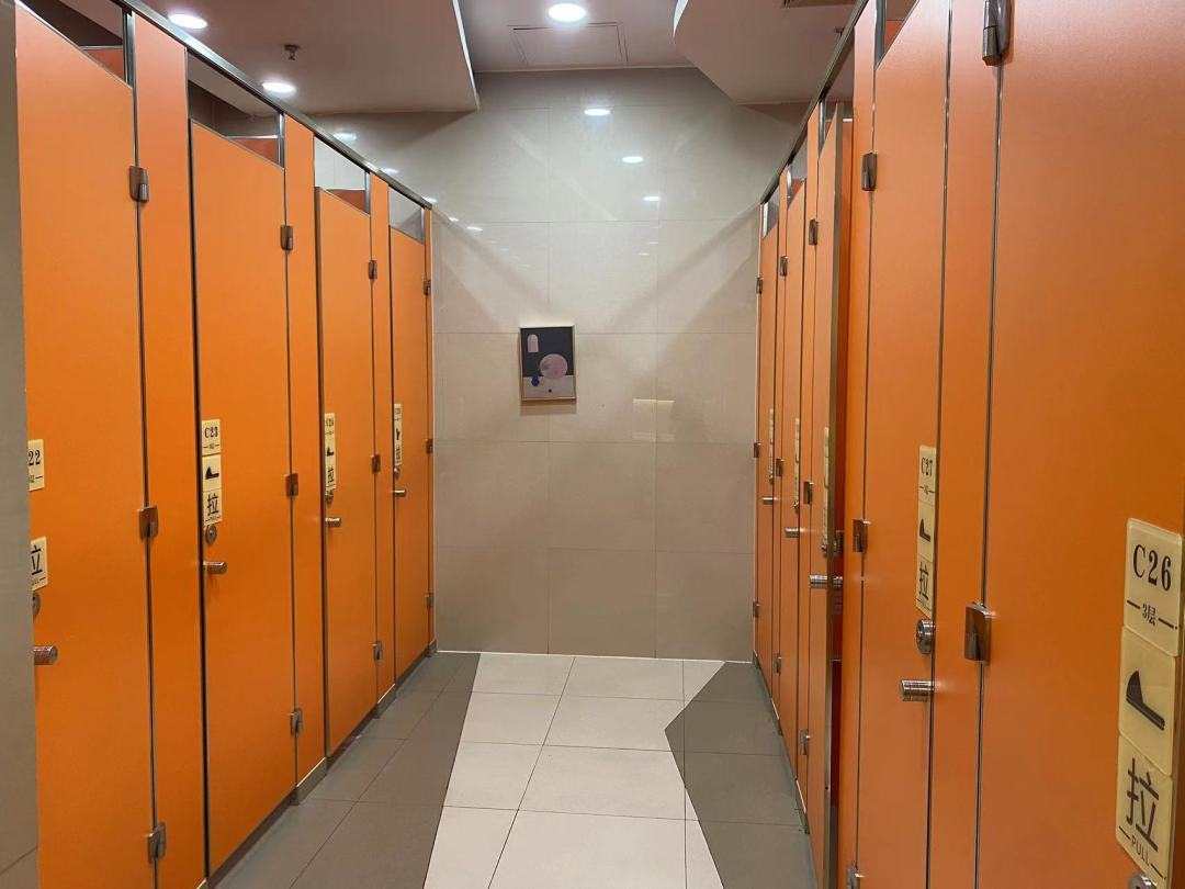 在市民广场的公共厕所里,共两排8个厕位,其中7个属于普通蹲位,一个坐便器厕位,均未安装扶手。厕所入口处设置了第三卫生间和无障碍卫生间,无障碍卫生间里是专用马桶并安装有助残疾人行动的扶手。